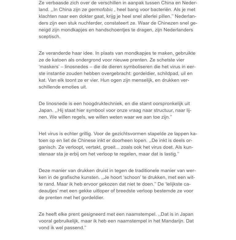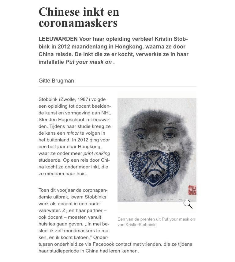 Een ander facet van haar werk zijn de vier panelen. Hierin komen de eerder genoemde elementen en karikaturen terug, ditmaal heeft zij geëxperimenteerd met de ‘spook druk’ van de linosnede en met stencils pandemie termen verwerkt. Dit werk bestaat uit vier unieke stukken en hieraan is ook de Chinese Mandarijn naamzegel toegevoegd. Deze naamzegel heeft Kristin Stobbink speciaal laten maken en verwijst naar het startpunt van het Coronavirus, China.